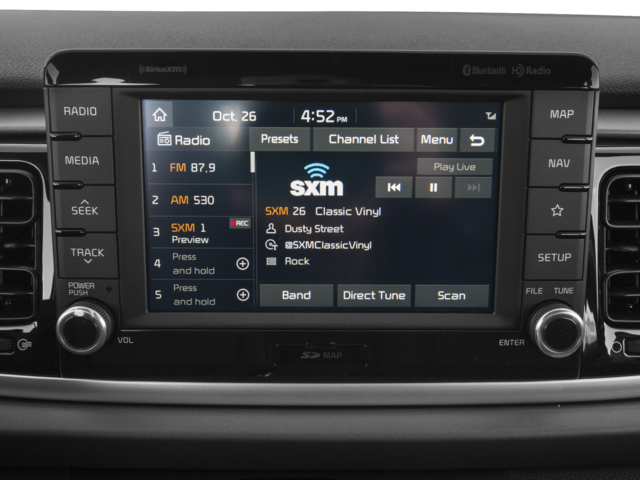 - Radio: UVO eServices w/AM/FM/MP3 -inc: SiriusXM satellite radio, 6 speakers including door-mounted tweeters, 5.0" rear-camera display, USB/auxiliary input jack and steering wheel-mounted audio controls